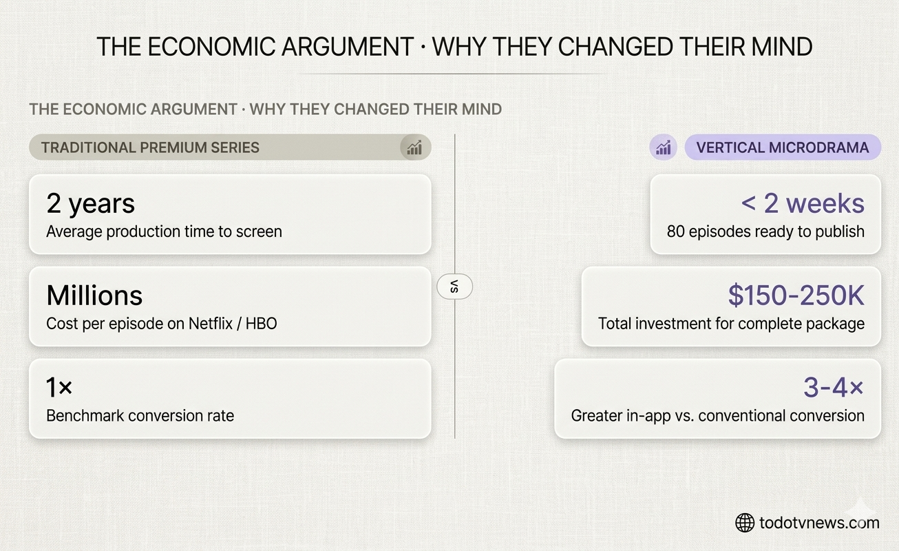 A premium Netflix or HBO series can take two years to hit screens, with massive per-episode costs. Meanwhile, an 80-episode microdrama package can be shot in under two weeks for somewhere between $150K and $250K total, based on figures floating around MIP London.