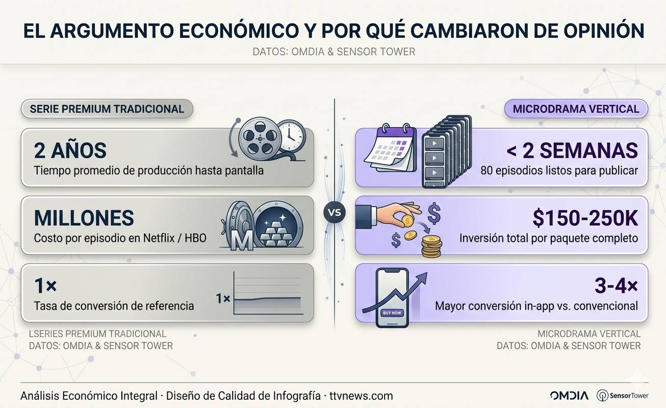 A premium Netflix or HBO series can take two years to hit screens, with massive per-episode costs. Meanwhile, an 80-episode microdrama package can be shot in under two weeks for somewhere between $150K and $250K total, based on figures floating around MIP London.