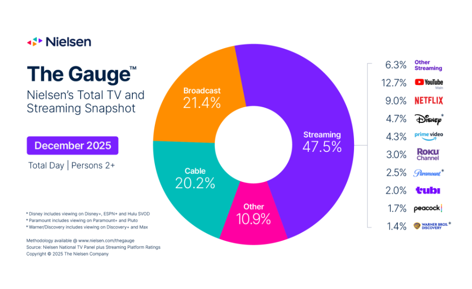 La audiencia de streaming capturó el 47,5 % de la televisión en diciembre de 2025, superando su récord anterior, establecido en julio de 2025, y alcanzando la mayor cuota de televisión jamás registrada en The Gauge™ de Nielsen.